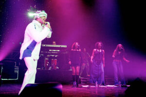 Also convincing those with tuned ears was bassist Fyffe, who replaced the inimitable virtuoso Stuart Zender in 1999’s Synkronized and subsequent tours to mixed reviews. His fluid lines and enormous, warm bottom end allowed McKenzie to drive the grooves home with a relentless bass drum and rapid-fire snare and tom rips. Percussionist Sola Akembala complemented the organic-electro grooves with subtle yet tasty additions, and DJ DZire, along with a second keyboard player (whose name I lost in Jay’s nervous British mumble) layered the sounds and samples accordingly. The normally audible and visible Toby Smith was kind of a background factor, which was disappointing; so was the absence of the three horn players and didgeridoo master Wallis Buchanan. The didg and brass were mainstays through Jamiroquai’s career thus far, but were replaced by three female backup singers, enhancing the house-disco-soul vibe but somewhat derailing the funk factor.